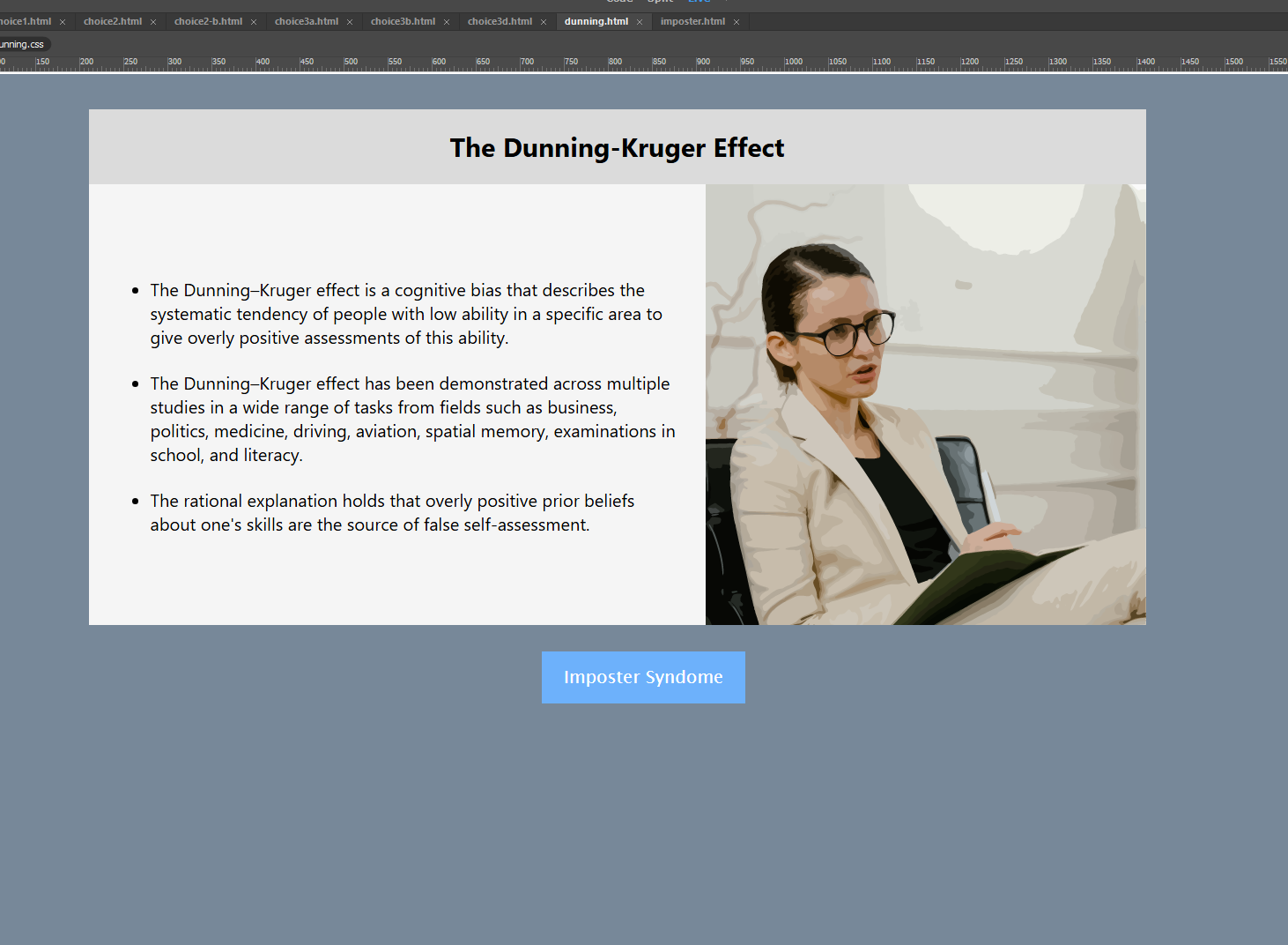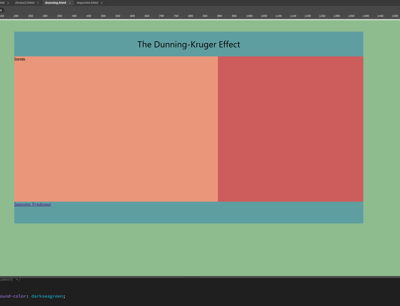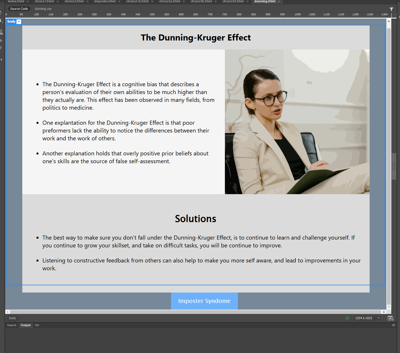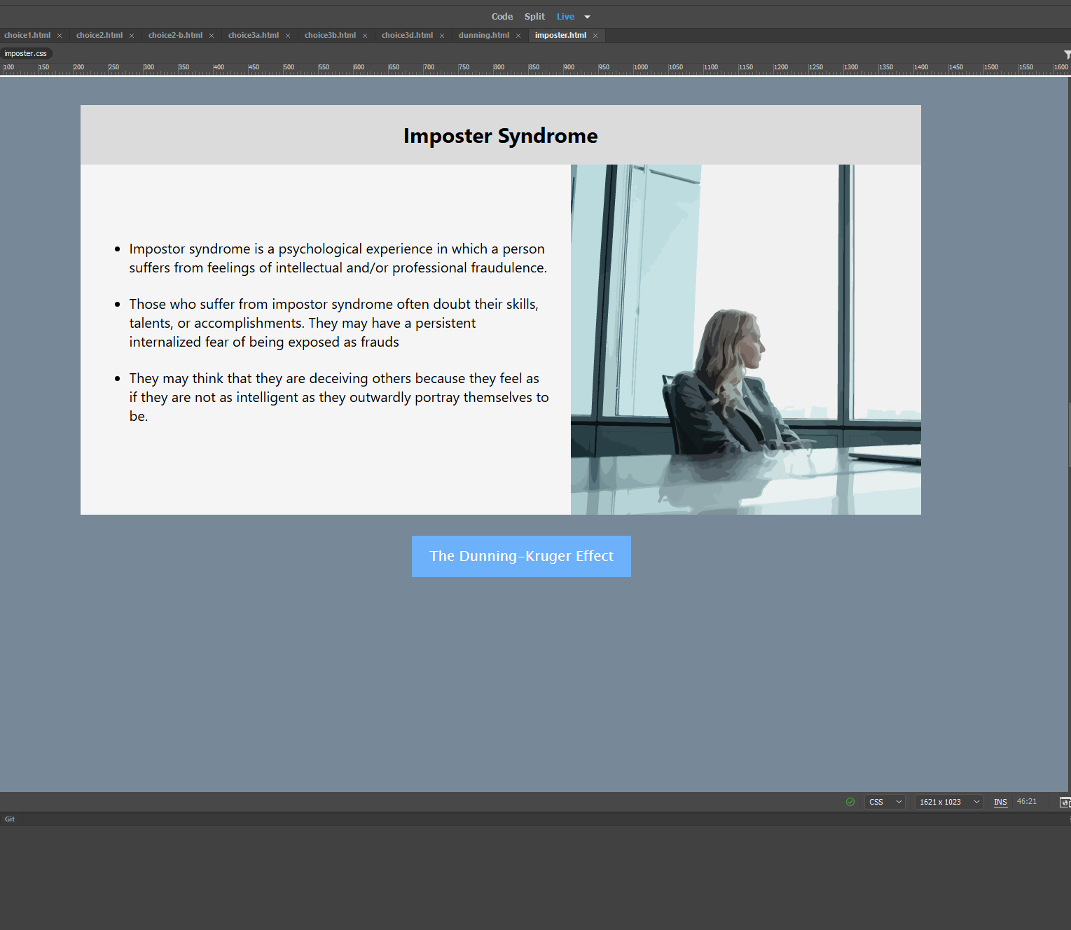 In order to build my site, I developed basic shells for each "type" of page I'd be creating. I created a launch, or title page, two styles of content pages, and two pages that would detail Imposter Syndrome and The Dunning-Kruger Effect.