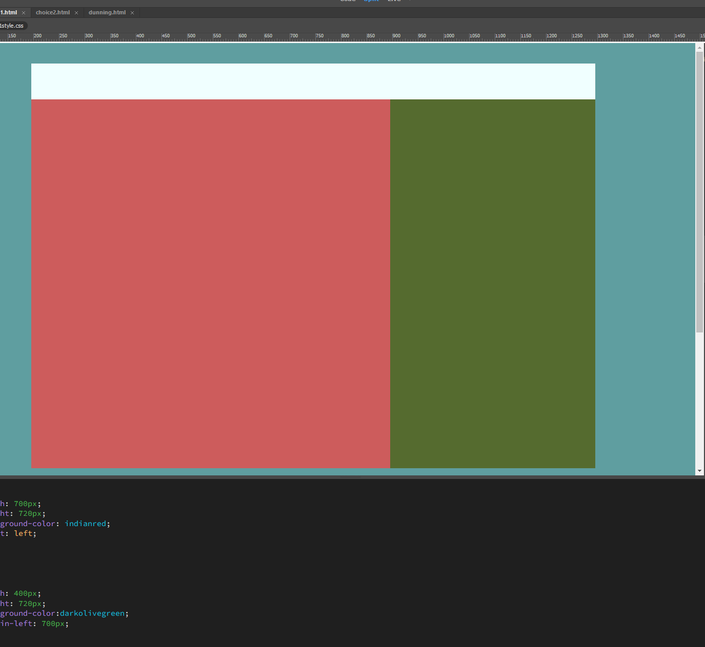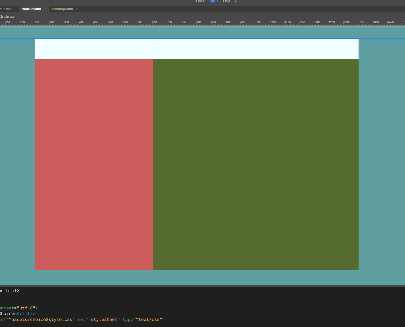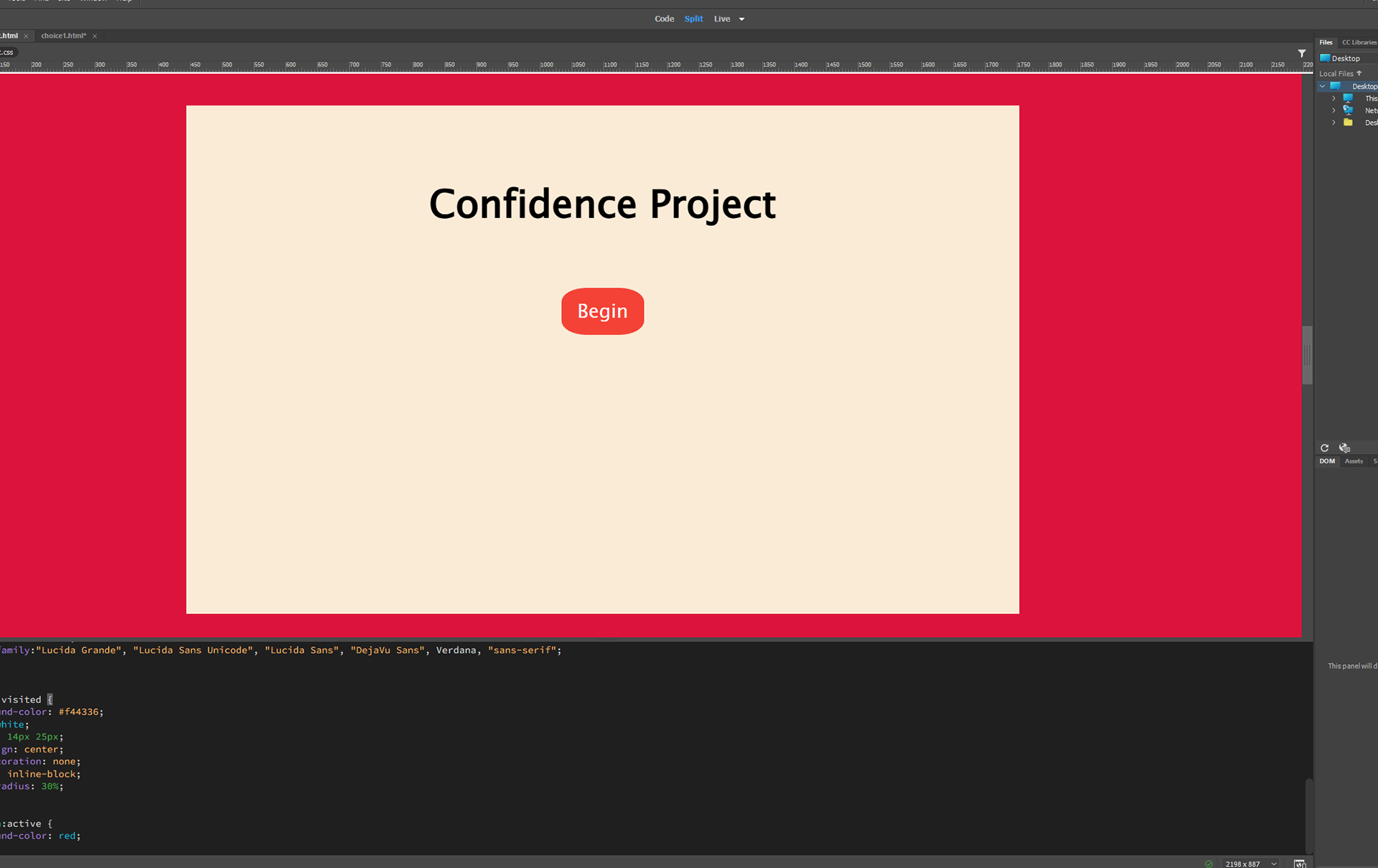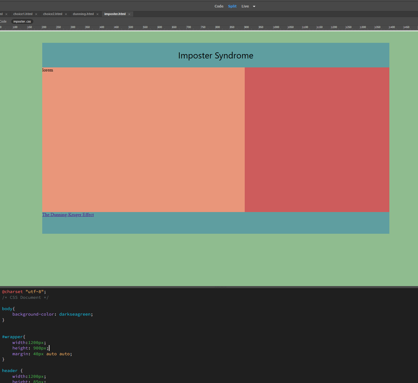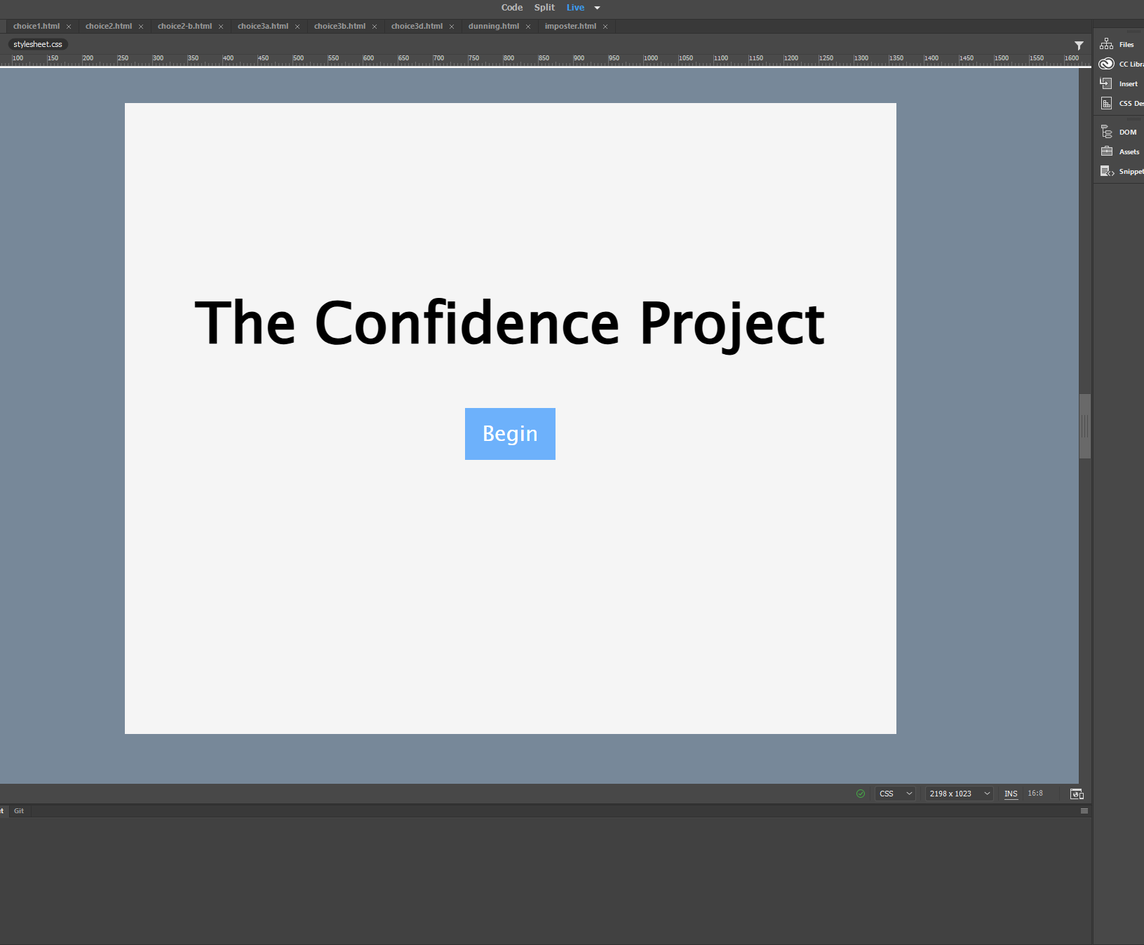In order to build my site, I developed basic shells for each "type" of page I'd be creating. I created a launch, or title page, two styles of content pages, and two pages that would detail Imposter Syndrome and The Dunning-Kruger Effect.