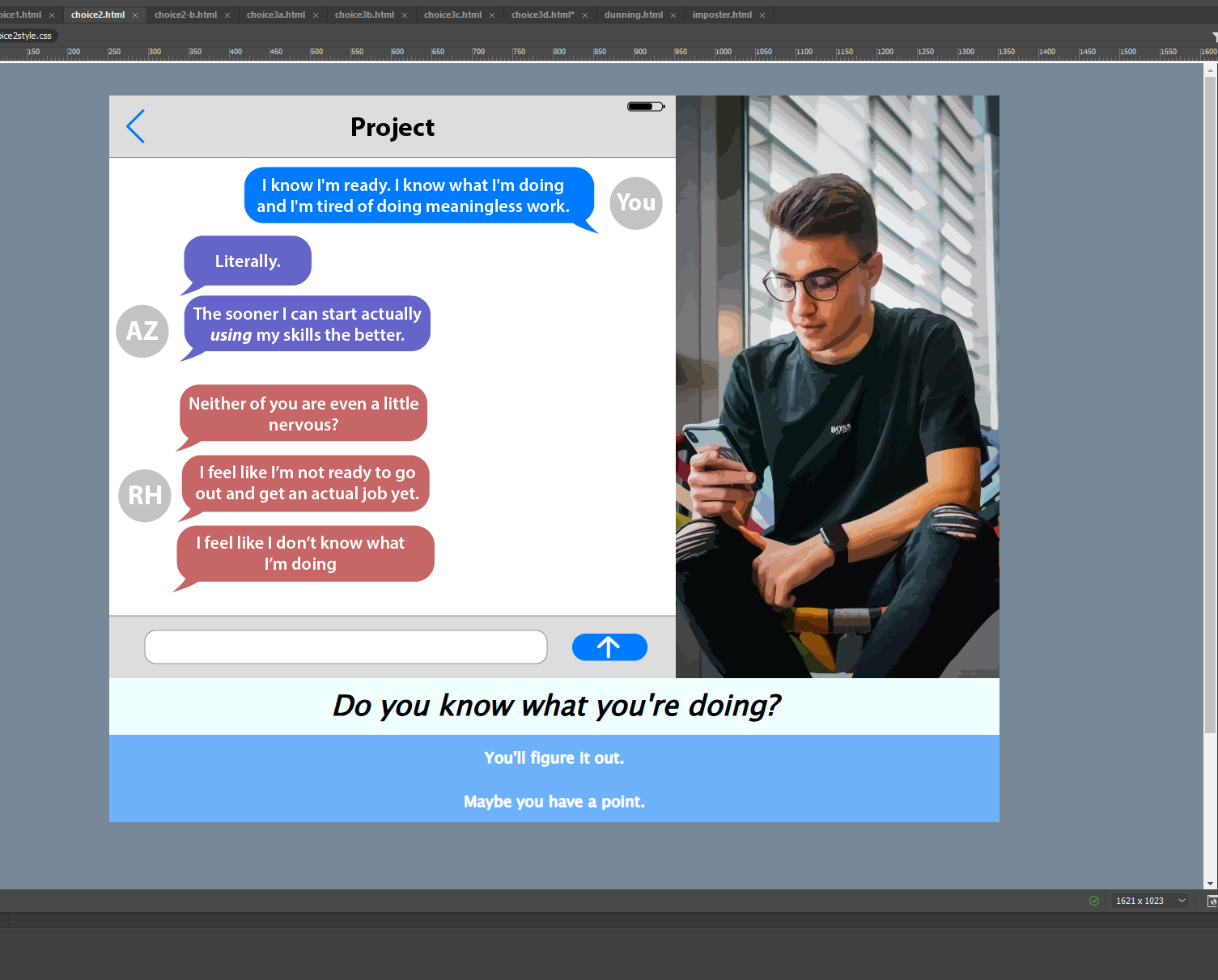 The Confidence Project is a narrative web-based choose your own adventure game centered around a text conversation between group mates about the future after graduation. It's characters represent Imposter Syndrome and The Dunning-Kruger Effect.