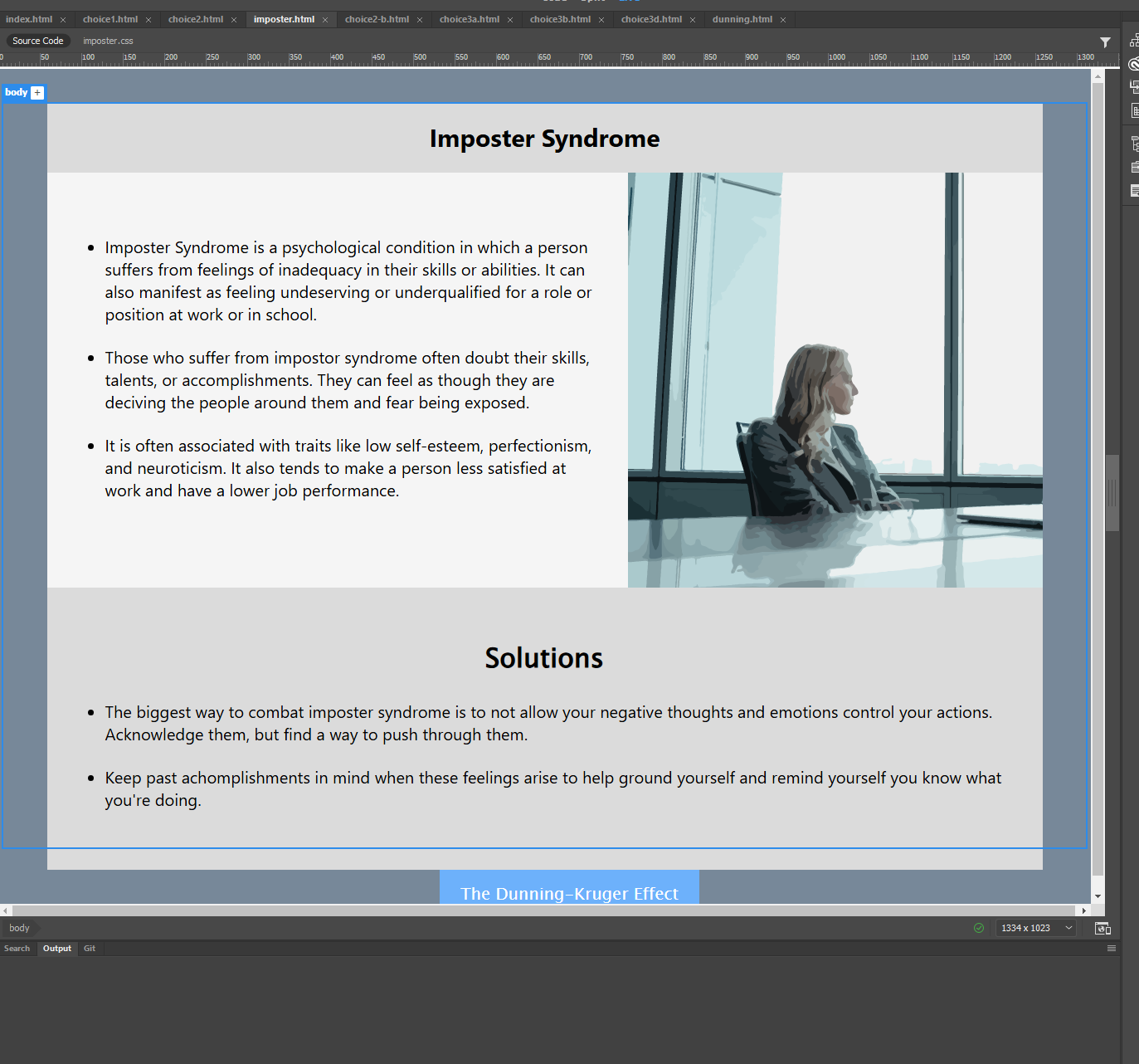 I decided to add "solutions" boxes to each of the pages detailing Imposter Syndrome and The Dunning-Kruger Effect.